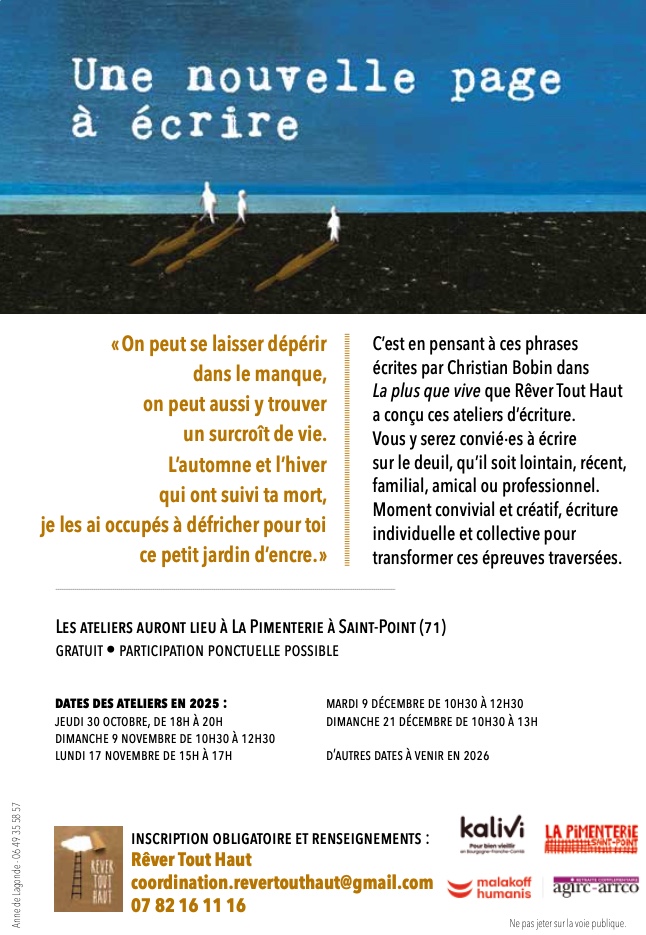 C’est en pensant à ces phrases écrites par Christian Bobin dans la préface de son livre évoquant la perte de sa « plus que vive » que nous avons conçu ce projet d’accompagnement de personnes endeuillées. Ce projet vient répondre à une nécessité de proposer aux personnes endeuillées, possiblement isolées, une activité collective, ressourçante, consolante. Une activité qui permette que l’intime et le personnel soient pris en charge par une forme de communauté et de solidarité.