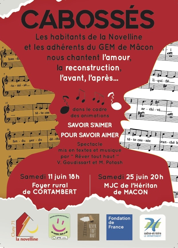A la demande de la résidence la Novelline, à Cluny (71), où vivent des personnes cérébro-lésées, rêver tout haut a conçu et anime deux cycles d’ateliers dans le cadre d’un projet global "Savoir s'aimer pour savoir aimer". Il s’agit de mettre en perspective et en création ce que la cérébro-lésion fait vivre au niveau affectif, sexuel, sensuel, corporel.