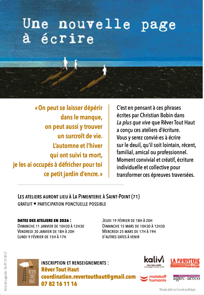 C’est en pensant à ces phrases écrites par Christian Bobin dans la préface de son livre évoquant la perte de sa « plus que vive » que nous avons conçu ce projet d’accompagnement de personnes endeuillées. Ce projet vient répondre à une nécessité de proposer aux personnes endeuillées, possiblement isolées, une activité collective, ressourçante, consolante. Une activité qui permette que l’intime et le personnel soient pris en charge par une forme de communauté et de solidarité.